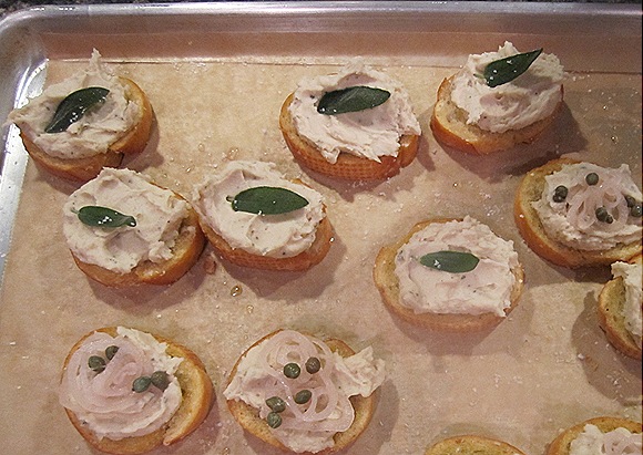 | Garlic Toasts with White Bean Puree, Fried Sage Leaves & Pickled Shallots Adapted from Vegetarian Cooking for Everyone by Deborah Madison Serves 4 White Bean Puree: 1 1/2 cups great northern beans 10 large sage leaves 2 bay leaves 1 head garlic about 1 cup extra-virgin olive oil juice of 1/2 lemon kosher salt & freshly ground black pepper First, cook the beans: Sort through the beans and discard any wayward pebbles. Then, either cover with cool water and soak overnight at room temperature, or cover with boiling water and soak one hour. Pour off the soaking liquid. Add the beans to a medium pot, along with the sage and bay leaves and about 1 tsp salt. Cover with water and simmer gently until very tender, about 45 minutes to an hour, stirring occasionally. When tender, remove the bay leaves and drain, saving the cooking liquid. While beans are cooking, prep the garlic: Pull apart the head of garlic into separate cloves. Slice off the tough bottom ends of each clove, and remove the peels, leaving the garlic cloves whole. Place peeled garlic cloves in a small sauce pot and cover just barely with extra-virgin olive oil. Turn heat to medium and simmer until garlic is tender and lightly golden brown, 30-40 minutes. Add the beans (along with the sage leaves), 1/4 cup of the garlic-cooking oil, 1 tsp salt and about half of the cooked garlic to the bowl of a food processor. Puree to smooth, then taste it. If you’d like more garlic, add a little more, or even all if it. (The strength of garlic can vary widely, so make sure you go by taste.) Puree for about two minutes, until the mixture is incredibly smooth. Add bean cooking liquid as needed, to give a spreadable consistency. To store, refrigerate in an air-tight container. Will keep about five days. Should be served at room temperature or slightly warm. Pickled Shallots: 1/2 # shallots 3/4 cup white wine vinegar 1 bay leaf 4 thyme sprigs 1 Tbl sugar 1 tsp salt 1 tsp pink peppercorns, lightly crushed Slice the top and bottom ends off of each shallot, and remove the peels. Using a mandolin or a sharp knife, thinly slice the shallots into rings. Place shallot rings into a large bowl, then pour boiling water over the shallots to cover. Soak 2 minutes, then drain and rinse and shallots. Combine the shallots with the vinegar, bay leaf, thyme, sugar, salt, peppercorns and 3/4 cup cold water. Place a plate on top, to help submerge the shallots. If there isn’t enough liquid to cover the shallots, add equal amounts of water and vinegar. Rest at room temperature for about 30 minutes, then refrigerate in an air-tight container until needed. Will keep about 2 weeks. Garlic Toasts: 1/2 French baguette garlic-cooking oil, from above flaky sea salt Preheat the oven to 375°F. Slice the bread into thick 1/2-inch rounds. Liberally brush both sides with the garlic oil. Arrange slices on a parchment-lined baking sheet, then sprinkle with salt. Bake until golden brown and crispy on the outside, but still tender and chewy on the inside, about 15 minutes. Time this so you can serve the hors d’oeuvres while the toasts are still warm. Fried Sage Leaves: 8-12 especially pretty sage leaves 1/2 cup vegetable oil kosher salt, to taste Add oil to a very small sauce pot and place over medium heat. When oil is about 350°F, add a couple sage leaves. (You don’t really need a thermometer for this. When you think it should be about hot enough, add one sage leaf. It should sizzle. If it doesn’t, the oil is too cold. If it burns right away, then it’s too hot.) It will only take about 3-4 seconds for the leaves to get crispy. Remove them from the oil with a fork and drain on a paper towel. Season immediately with a small sprinkle of salt. Repeat with remaining sage leaves. You should serve these not too long after frying, so they stay crisp. Final Assembly: everything prepared above about 1 Tbl capers Spread a couple tablespoons of bean puree on top of each warm garlic toast. Garnish half with a single fried sage leaf, and half with a cluster of pickled shallots and about 5-6 capers. |